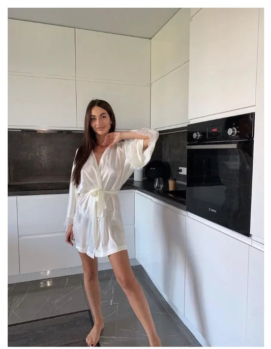 Ochtendjas dames katoen - Elegante zijden look met kantdetails voor een zomerse ochtend