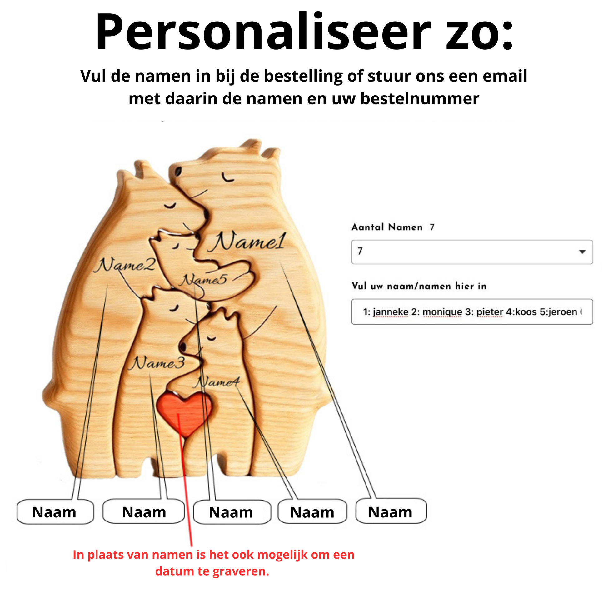 Geef de namen van je gezinsleden op die op elke beer gegraveerd worden.